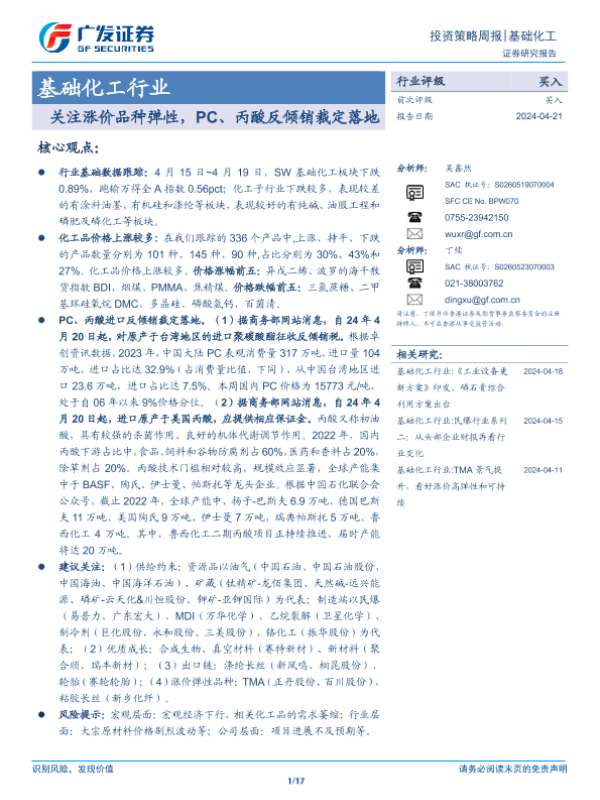 【广发证券】【20240421】基础化工行业:关注涨价品种弹性,PC、丙酸反倾销裁定落地-17页 行业研究