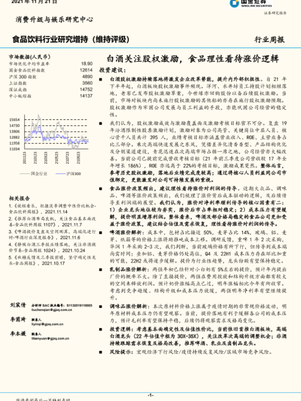 【国金证券】【20211121】20211121-国金证券-食品饮料行业研究:白酒关注股权激励,食品理性看待涨价逻辑-18页 行业研究