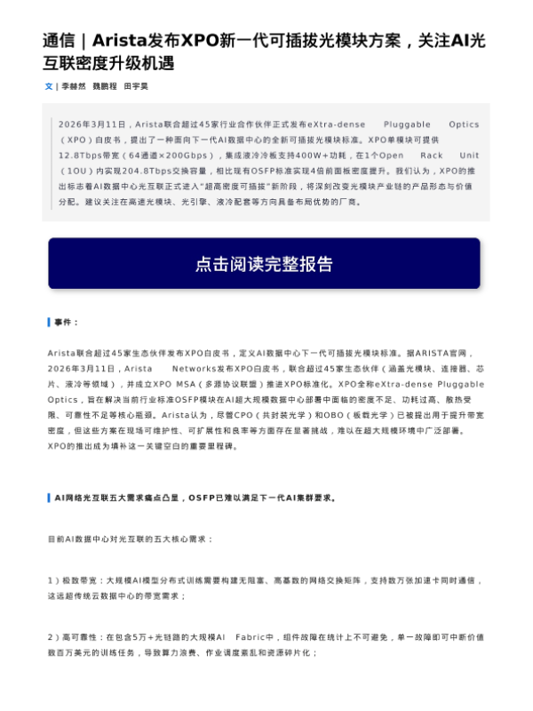 【中信证券】【2026】Arista发布XPO新一代可插拔光模块方案,关注AI光互联密度升级机遇-4页 证券期货研究报告
