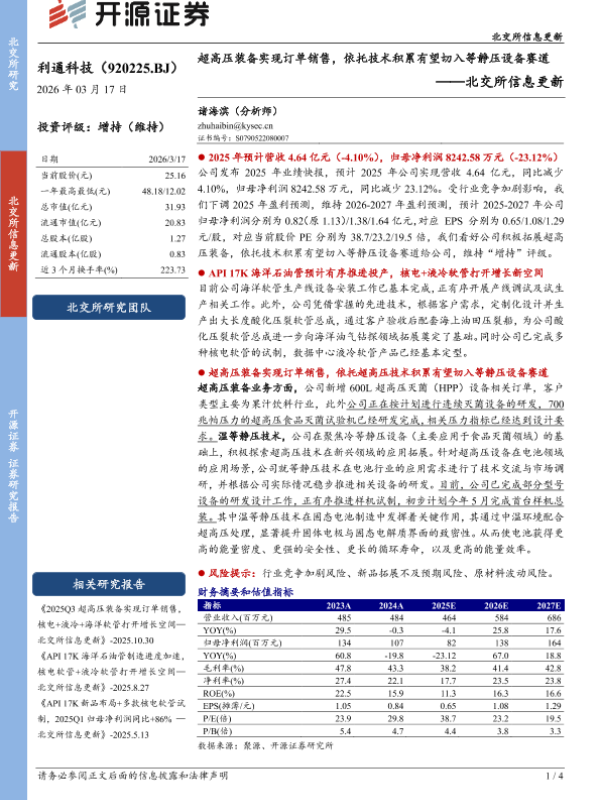 【开源证券】【202603】北交所信息更新:超高压装备实现订单销售,依托技术积累有望切入等静压设备赛道-4页 证券期货研究报告