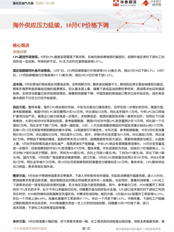 【华泰期货】【202510】液化石油气月报 | 海外供应压力延续,10月CP价格下调-9页 证券期货研究报告