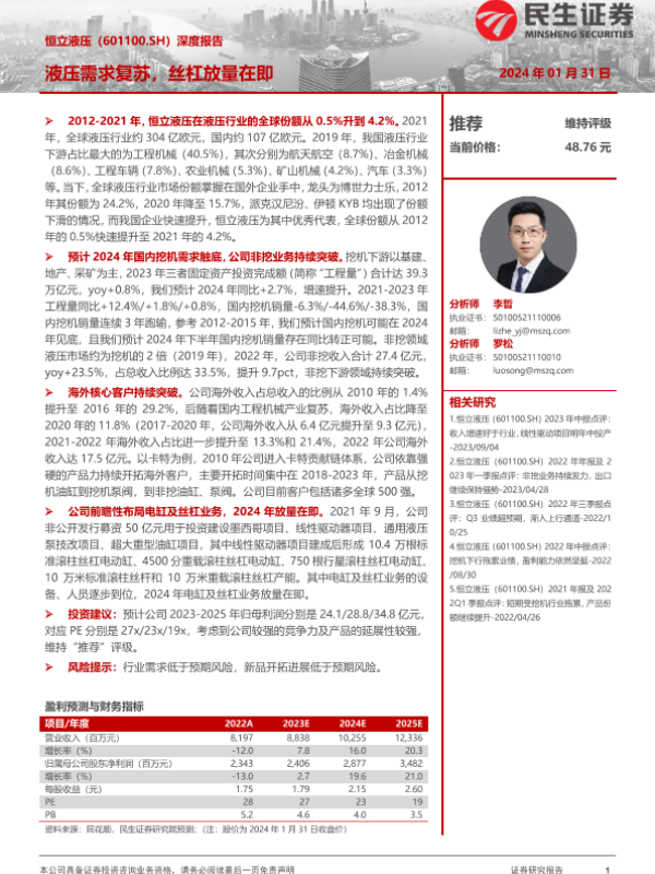 【民生证券】【20240131】20240131-民生证券-恒立液压-601100.SH-深度报告:液压需求复苏,丝杠放量在即-31页 行业研究