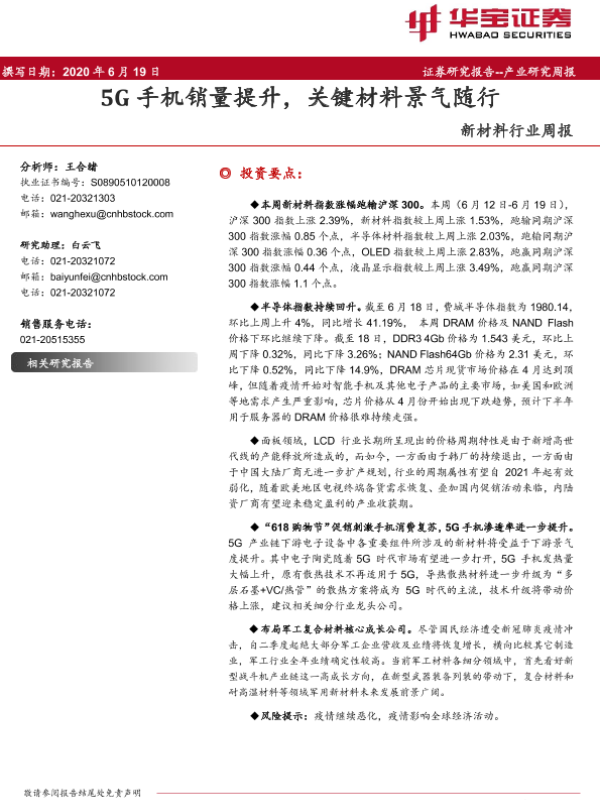 【华宝证券】【20200619】20200619-华宝证券-新材料行业周报:5G手机销量提升,关键材料景气随行-12页 行业研究