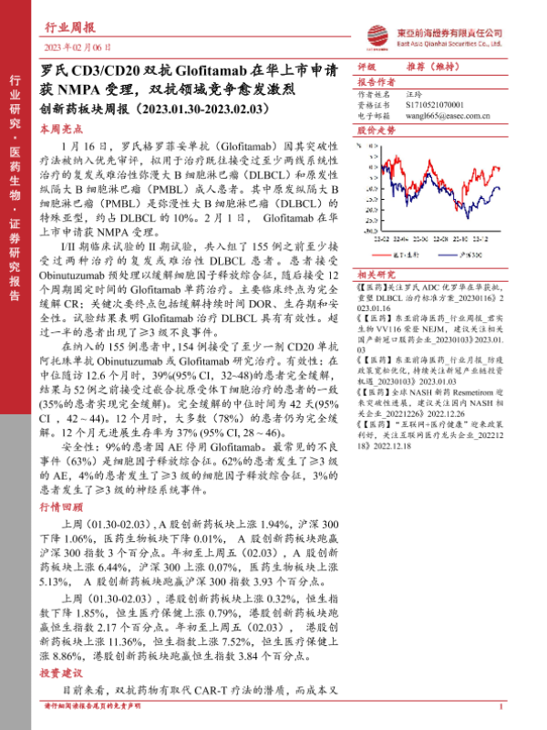 【东亚前海证券】【20230206】罗氏CD3 CD20双抗Glofitamab在华上市申请获NMPA受理,双抗领域竞争愈发激烈-20页 行业研究