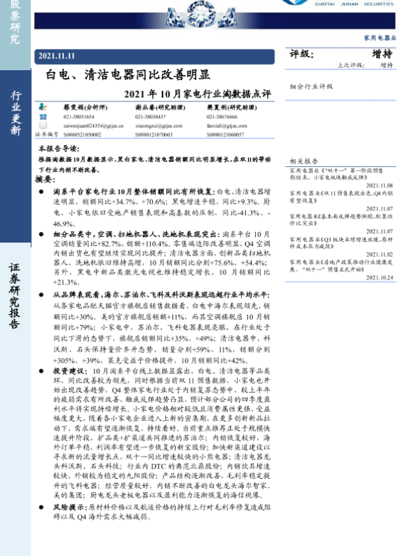 【国泰君安证券】【20211111】2021年10月家电行业淘数据点评:白电、清洁电器同比改善明显-6页 行业研究