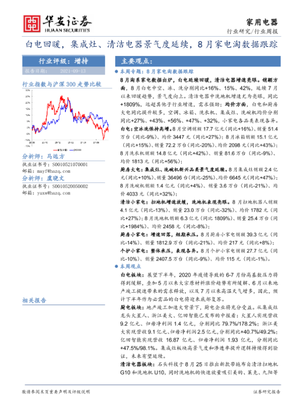【华安证券】【20210913】家用电器行业周报:白电回暖,集成灶、清洁电器景气度延续,8月家电淘数据跟踪-14页 行业研究