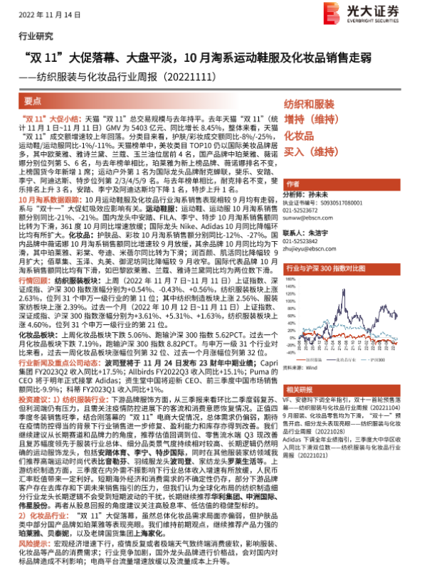 【光大证券】【20221114】20221114-光大证券-纺织服装与化妆品行业周报:“双11”大促落幕、大盘平淡,10月淘系运动鞋服及化妆品销售走弱-14页 行业研究