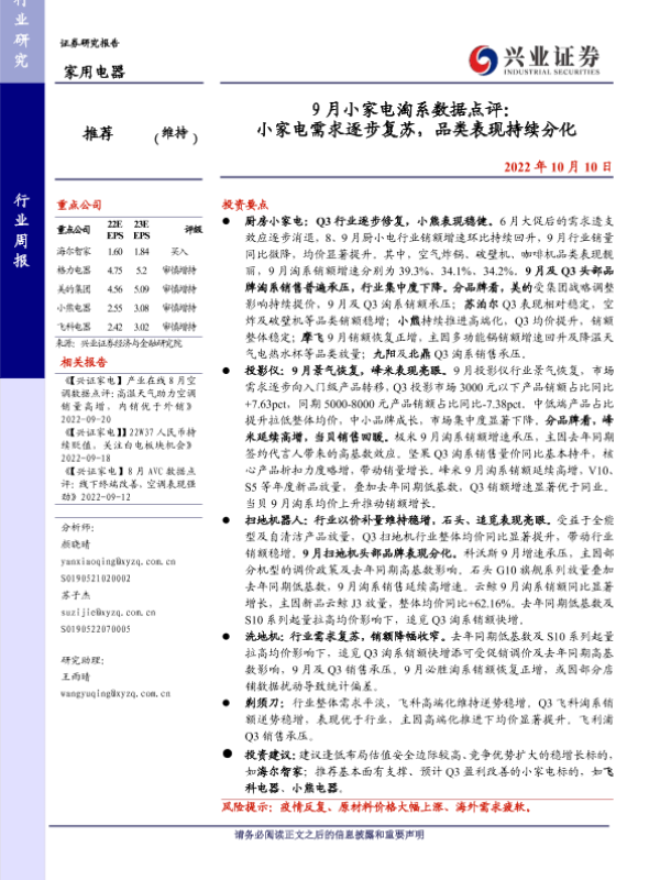 【兴业证券】【20221010】9月小家电淘系数据点评:小家电需求逐步复苏,品类表现持续分化-10页 行业研究