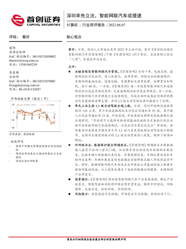 【首创证券】【20220607】深圳率先立法,智能网联汽车或提速-2页 行业研究