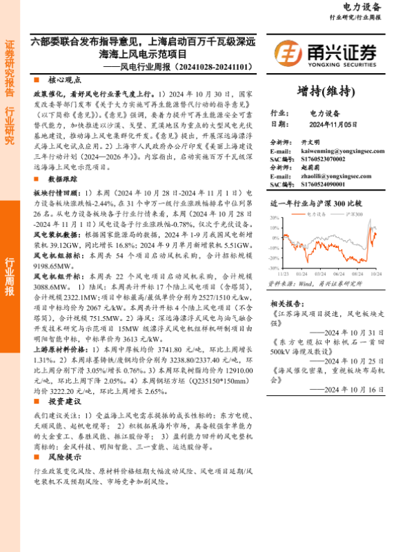 【甬兴证券】【20241105】20241105-甬兴证券-风电行业周报:六部委联合发布指导意见,上海启动百万千瓦级深远海海上风电示范项目-14页 行业研究