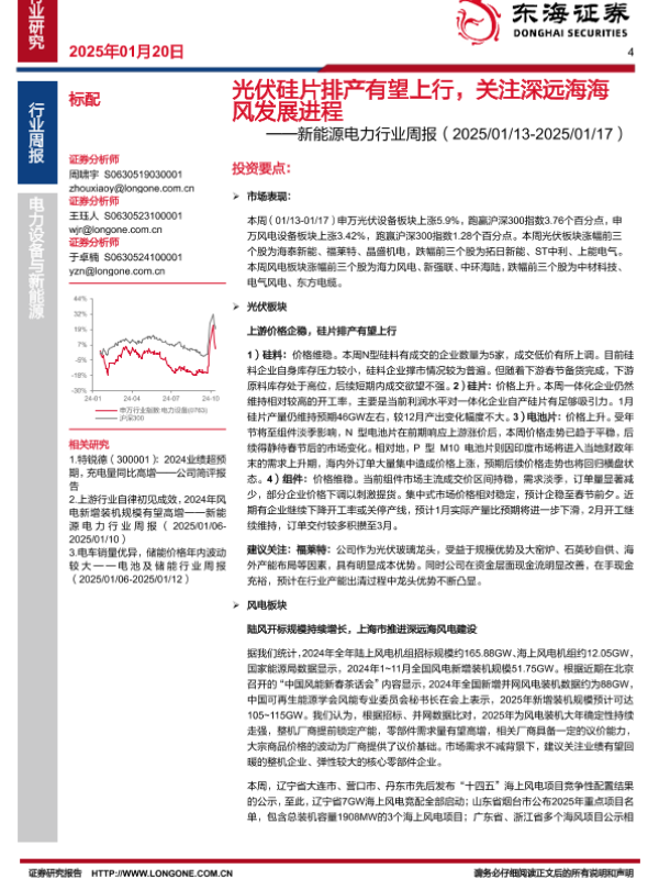 【东海证券】【20250120】2025年01月23日更新-【东海证券】新能源电力行业周报:光伏硅片排产有望上行,关注深远海海风发展进程-15页 行业研究