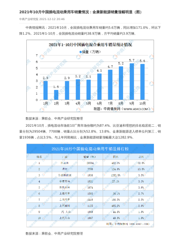 【中商产业研究院】【20211212】2021年10月中国插电混动乘用车销量情况-2页 市场调研