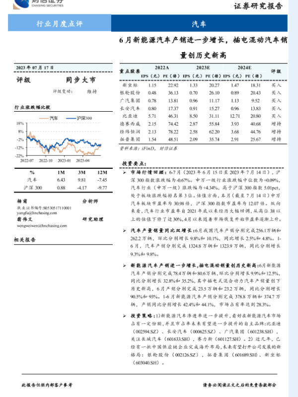 【财信证券】【20230717】20230717-财信证券-汽车行业月度点评:6月新能源汽车产销进一步增长,插电混动汽车销量创历史新高-11页 行业研究