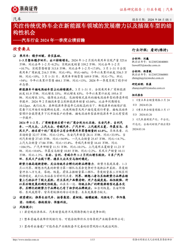 【浙商证券】【20240405】汽车行业2024年一季度业绩前瞻:关注传统优势车企在新能源车领域的发展潜力以及插混车型的结构性机会-13页 行业研究