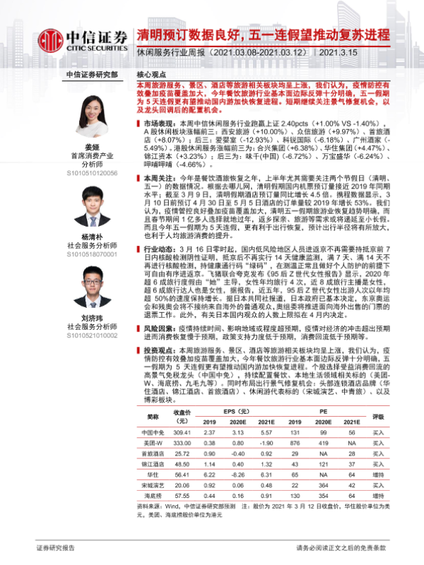 【中信证券】【20210315】休闲服务行业周报:清明预订数据良好,五一连假望推动复苏进程-13页 行业研究