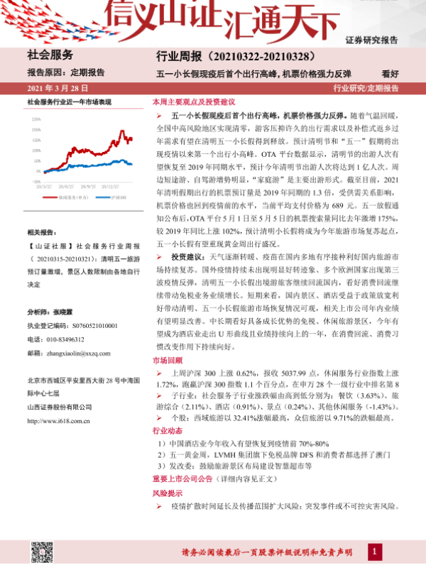 【山西证券】【20210328】社会服务行业周报:五一小长假现疫后首个出行高峰,机票价格强力反弹-9页 行业研究