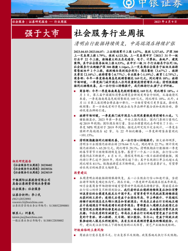 【中银证券】【20230409】社会服务行业周报:清明出行数据持续恢复,中高端酒店持续扩张-17页 行业研究