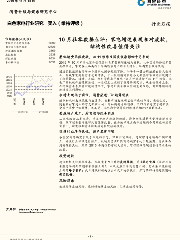 【国金证券】【20191115】白色家电行业研究10月社零数据点评:家电增速表现相对疲软,结构性改善值得关注-8页 行业研究