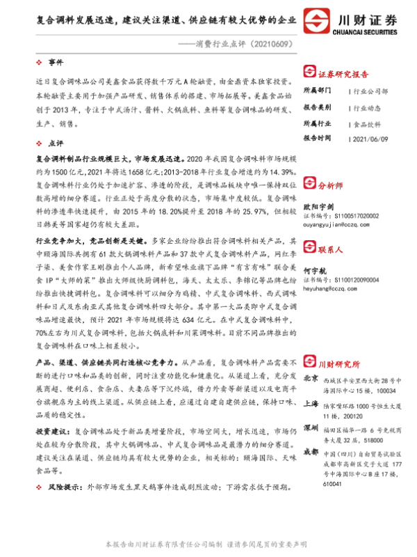 【川财证券】【20210609】消费行业点评:复合调料发展迅速,建议关注渠道、供应链有较大优势的企业-2页 行业研究