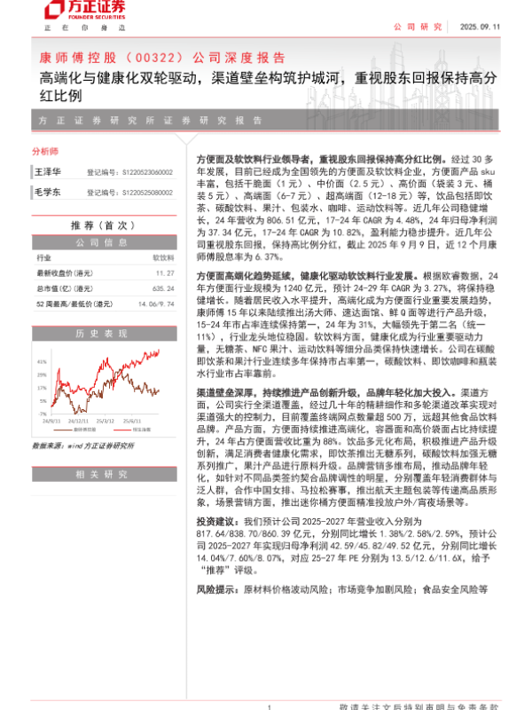 【方正证券】【202509】康师傅控股( 0 0 3 2 2)公司深度报告:高端化与健康化双轮驱动,渠道壁垒构筑护城河,重视股东回报保持高分红比例-32页 公司研究