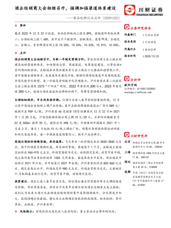 【川财证券】【20201222】食品饮料行业点评:酒企经销商大会相继召开,强调加强渠道体系建设-2页 行业研究