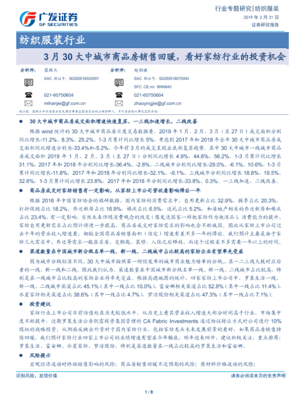 【广发证券】【20190331】3月30大中城市商品房销售回暖,看好家纺行业的投资机会-8页 行业研究