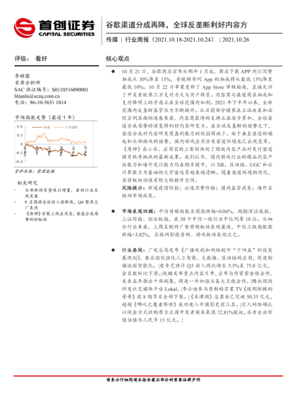 【首创证券】【20211026】20211026-首创证券-传媒行业周报:谷歌渠道分成再降,全球反垄断利好内容方-11页 行业研究