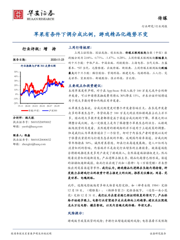 【华安证券】【20201123】20201123-华安证券-传媒行业周报:苹果有条件下调分成比例,游戏精品化趋势不变-19页 行业研究