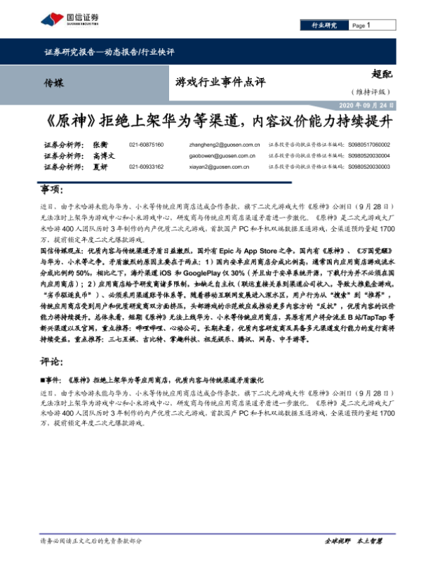 【国信证券】【20200924】游戏行业事件点评:《原神》拒绝上架华为等渠道,内容议价能力持续提升-5页 行业研究