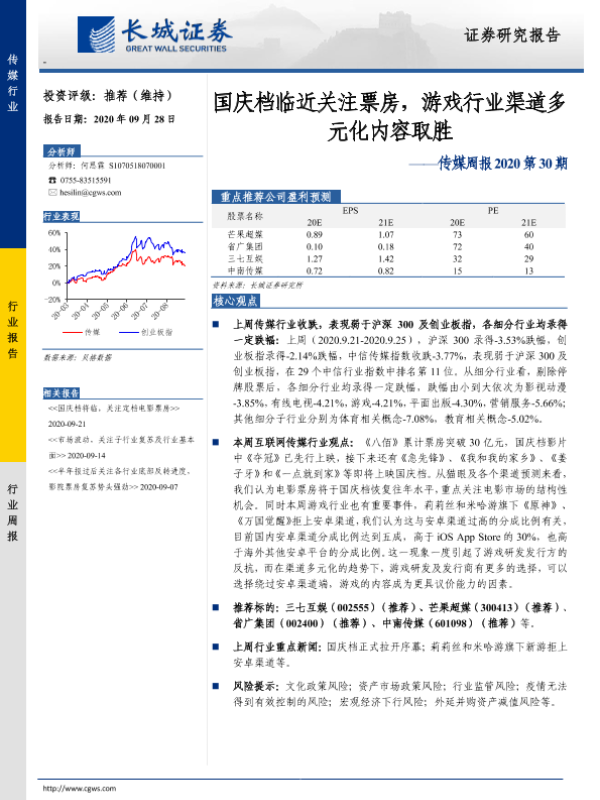 【长城证券】【20200928】传媒周报2020第30期:国庆档临近关注票房,游戏行业渠道多元化内容取胜-12页 行业研究