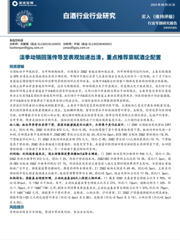 【国金证券】【20250831】白酒行业-淡季动销回落传导至表观加速出清,重点推荐禀赋酒企配置-22页 证券期货研究报告
