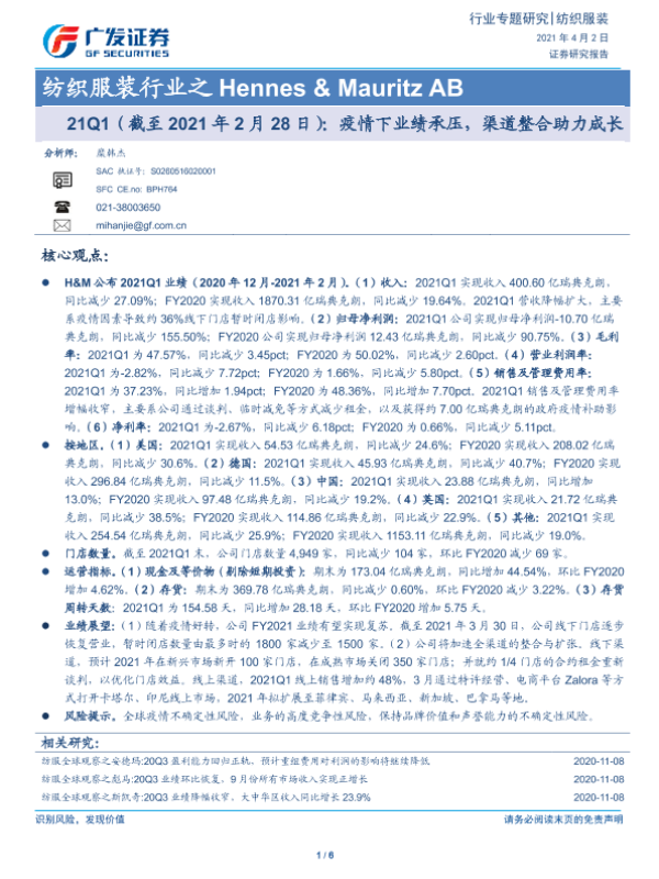 【广发证券】【20210402】纺织服装行业之Hennes&Mauritz AB:21Q1(截至2021年2月28日):疫情下业绩承压,渠道整合助力成长-6页 行业研究