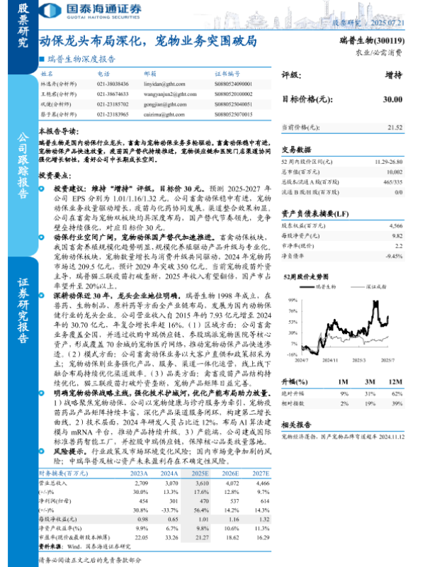 【国泰海通证券】【20250721】瑞普生物(300119)深度报告:动保龙头布局深化,宠物业务突围破局-18页 公司研究