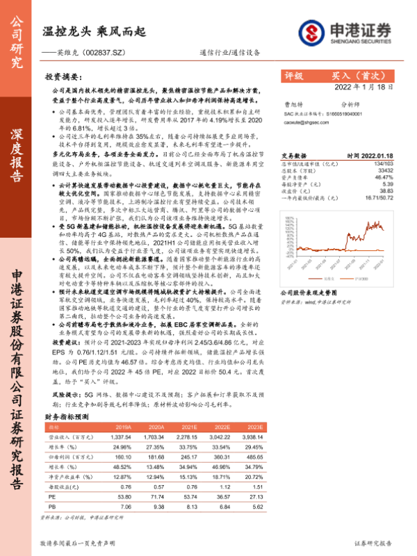 【申港证券】【20220118】温控龙头乘风而起——英维克(002837.SZ)-23页 行业研究