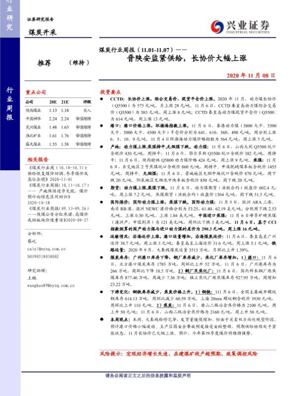 【兴业证券】【20201108】煤炭行业周报(11.01-11.07)——晋陕安监紧供给,长协价大幅上涨-15页 行业研究