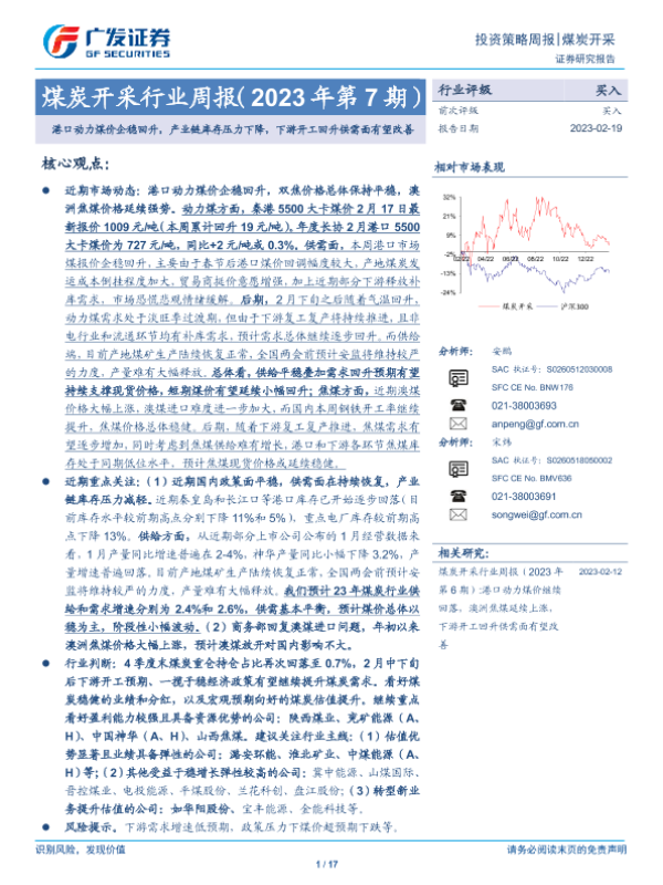 【广发证券】【20230219】20230219-广发证券-煤炭开采行业周报(2023年第7期):港口动力煤价企稳回升,产业链库存压力下降,下游开工回升供需面有望改善-17页 行业研究