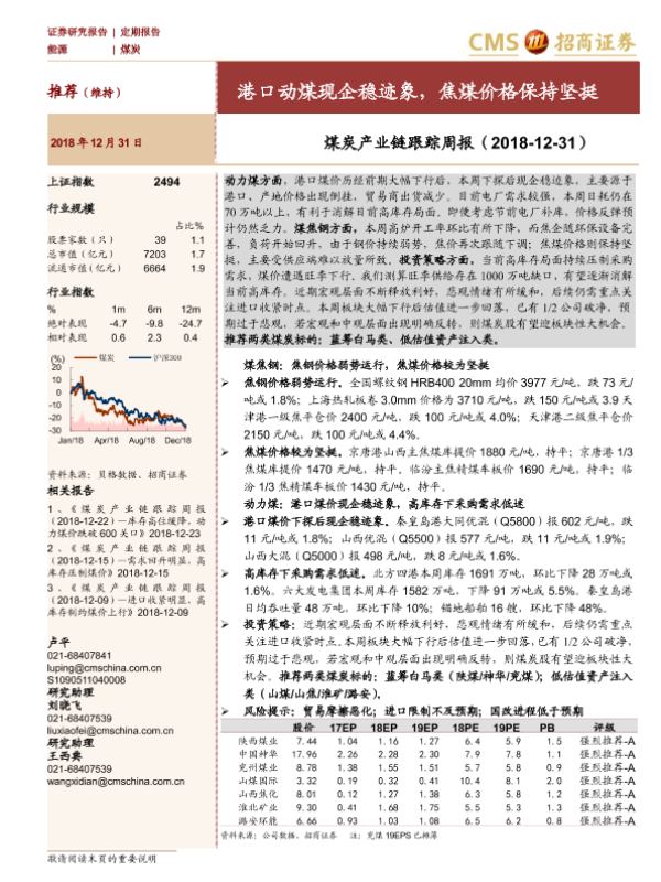 【海通证券】【20181231】20181231-招商证券-煤炭产业链跟踪周报:港口动煤现企稳迹象,焦煤价格保持坚挺-20页 行业研究