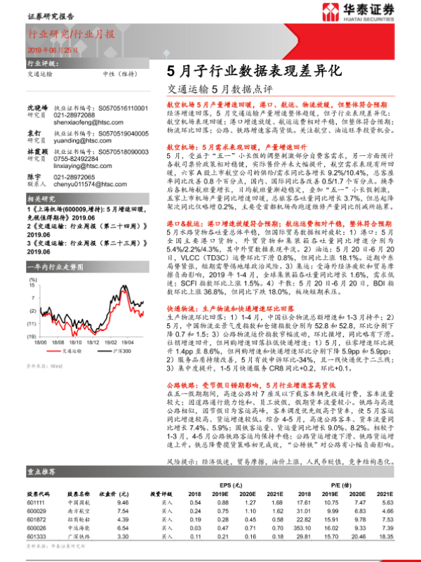 【华泰证券】【20190625】交通运输5月数据点评:5月子行业数据表现差异化-26页 行业研究