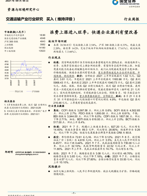 【国金证券】【20210905】交通运输产业行业研究:派费上涨进入旺季,快递企业盈利有望改善-14页 行业研究