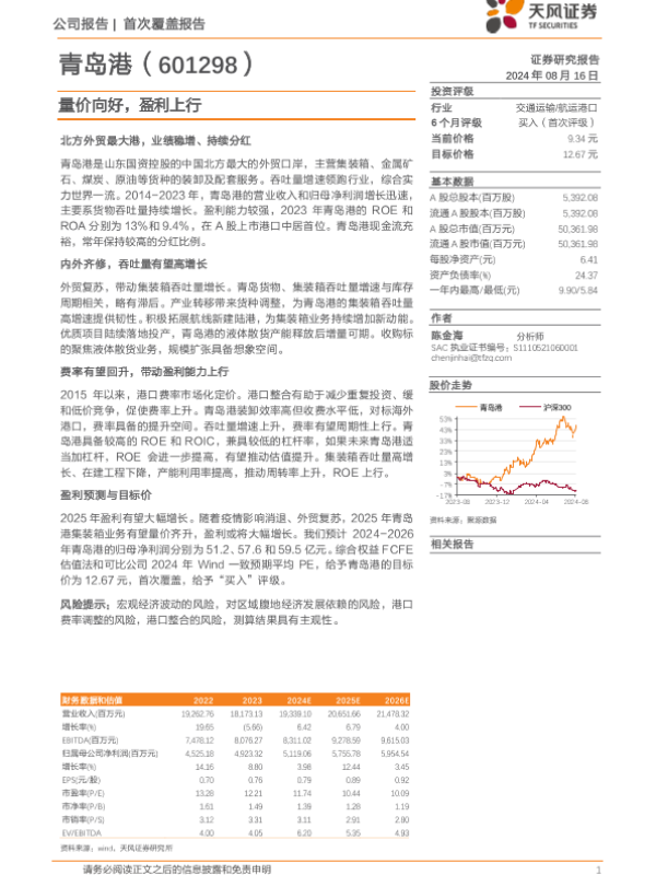 【天风证券】【20240816】20240816-天风证券-青岛港-601298.SH-量价向好,盈利上行-20页 行业研究