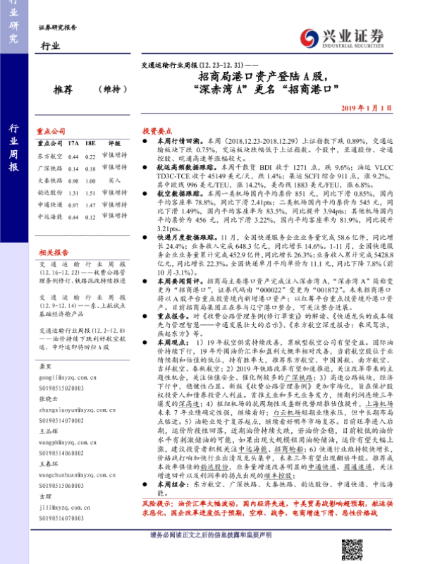 【兴业证券】【20190101】交通运输行业周报:招商局港口资产登陆A股,“深赤湾A”更名“招商港口”-14页 行业研究