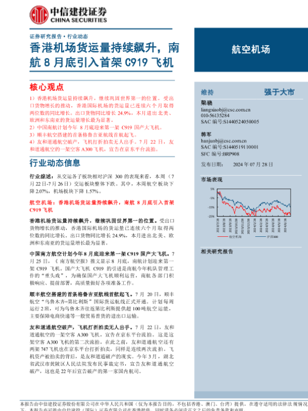 【中信建投证券】【20240728】航空机场行业:香港机场货运量持续飙升,南航8月底引入首架C919飞机-23页 行业研究
