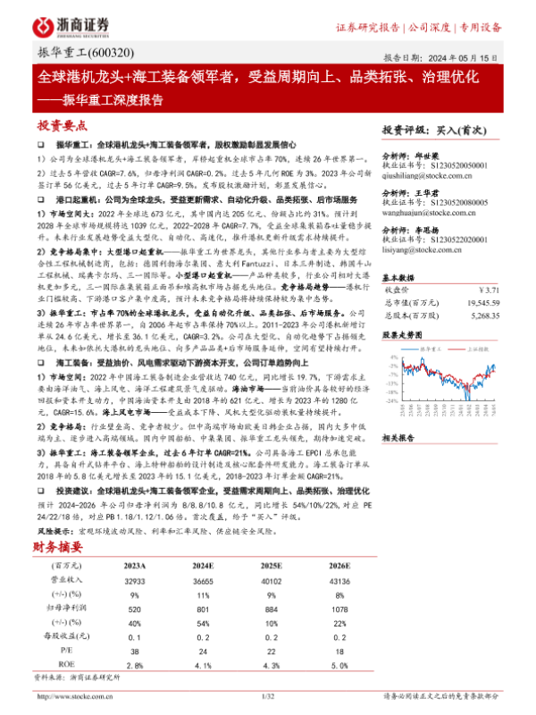 【浙商证券】【20240515】振华重工(600320)深度报告:全球港机龙头+海工装备领军者,受益周期向上、品类拓张、治理优化-32页 行业研究