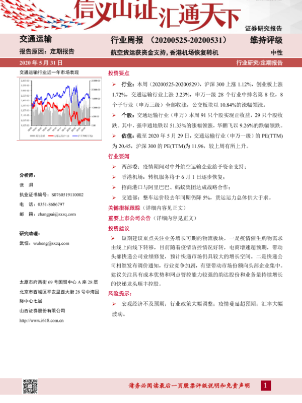 【山西证券】【20200531】交通运输行业周报:航空货运获资金支持,香港机场恢复转机-14页 行业研究