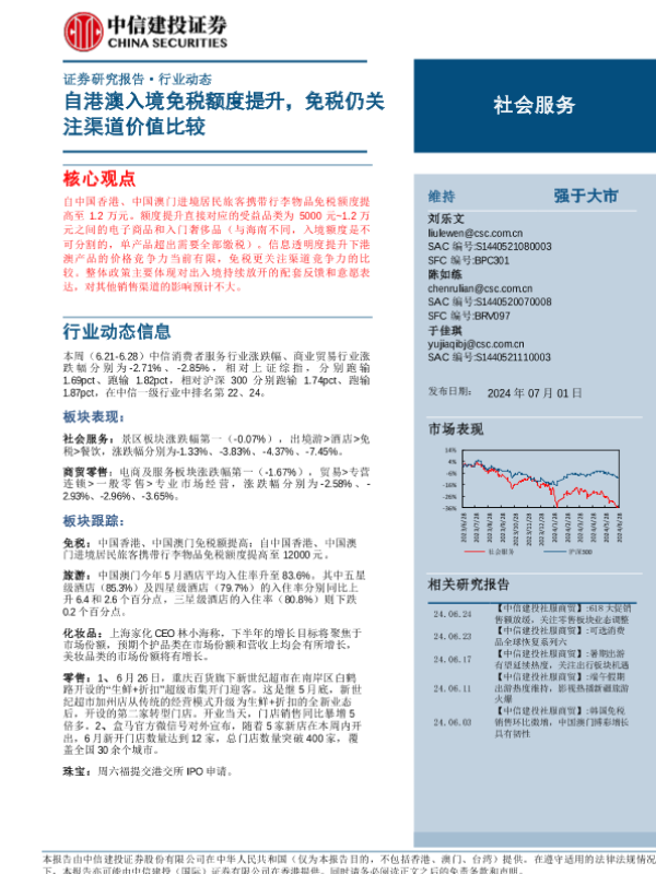 【中信建投证券】【20240701】社会服务行业:自港澳入境免税额度提升,免税仍关注渠道价值比较-30页 行业研究