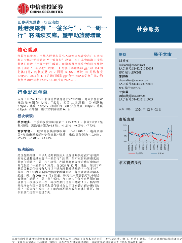 【中信建投证券】【20241202】2024年12月15日更新-【中信建投】社会服务行业:赴港澳旅游“一签多行”、“一周一行”将陆续实施,望带动旅游增量-26页 行业研究