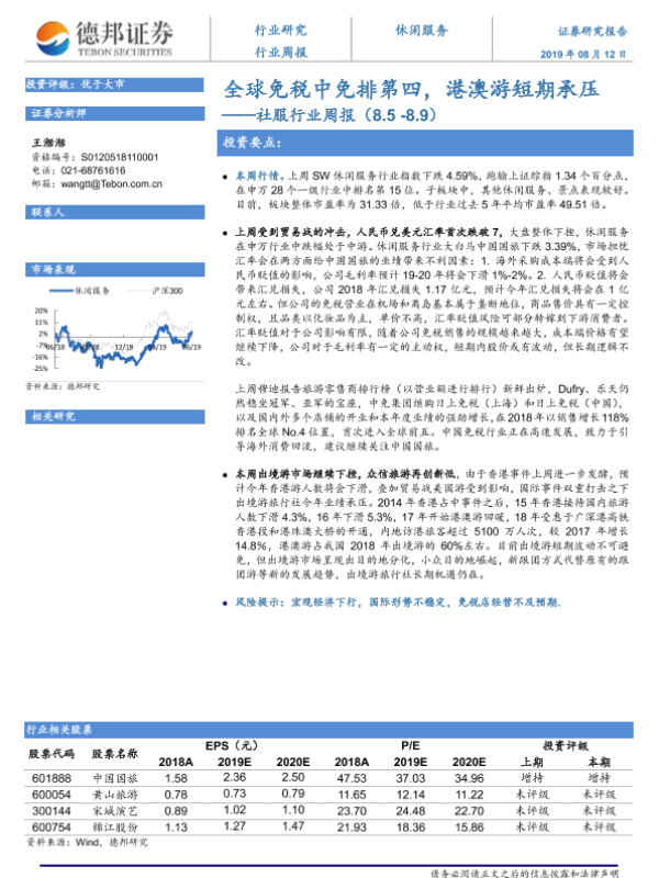 【德邦证券】【20190812】社服行业周报:全球免税中免排第四,港澳游短期承压-8页 行业研究