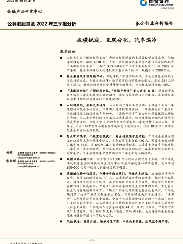 【国金证券】【20221031】公募港股基金2022年三季报分析:规模锐减,互联分化,汽车遇冷-19页 行业研究