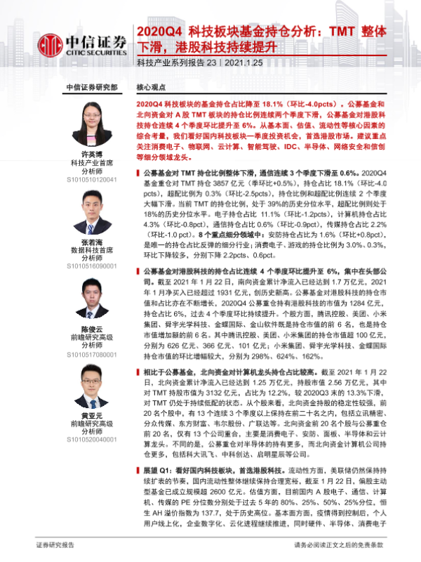 【中信证券】【20210125】2020Q4科技板块基金持仓分析:TMT整体下滑,港股科技持续提升-19页 行业研究