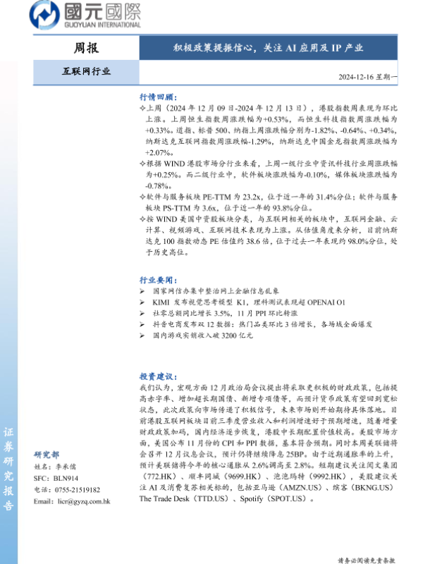【国元国际】【20241216】互联网行业周报:积极政策提振信心,关注AI应用及IP产业-11页 行业研究
